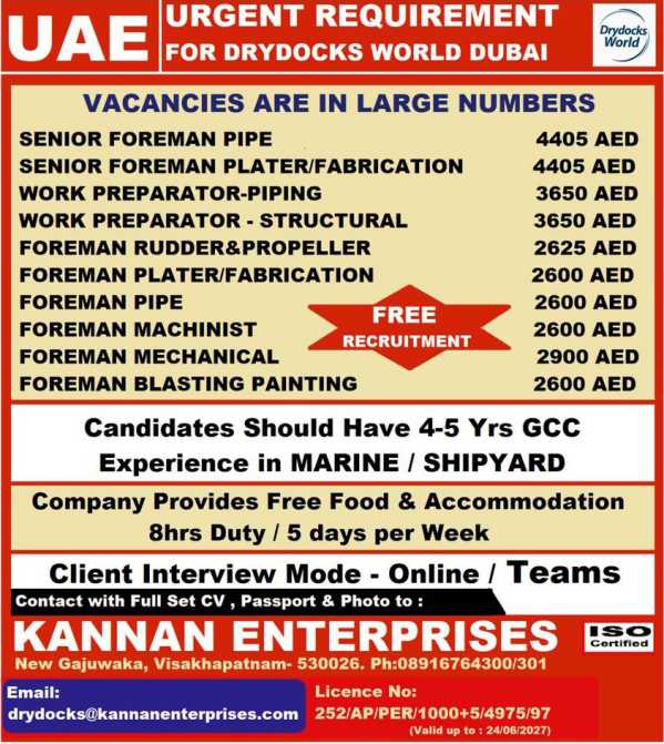 Free Recruitments | Urgent requirements for Drydocks world in Dubai (UAE). Vacancies are in large numbers. All candidates should have 4-5 years of GCC experience in Marine / Shipyard.